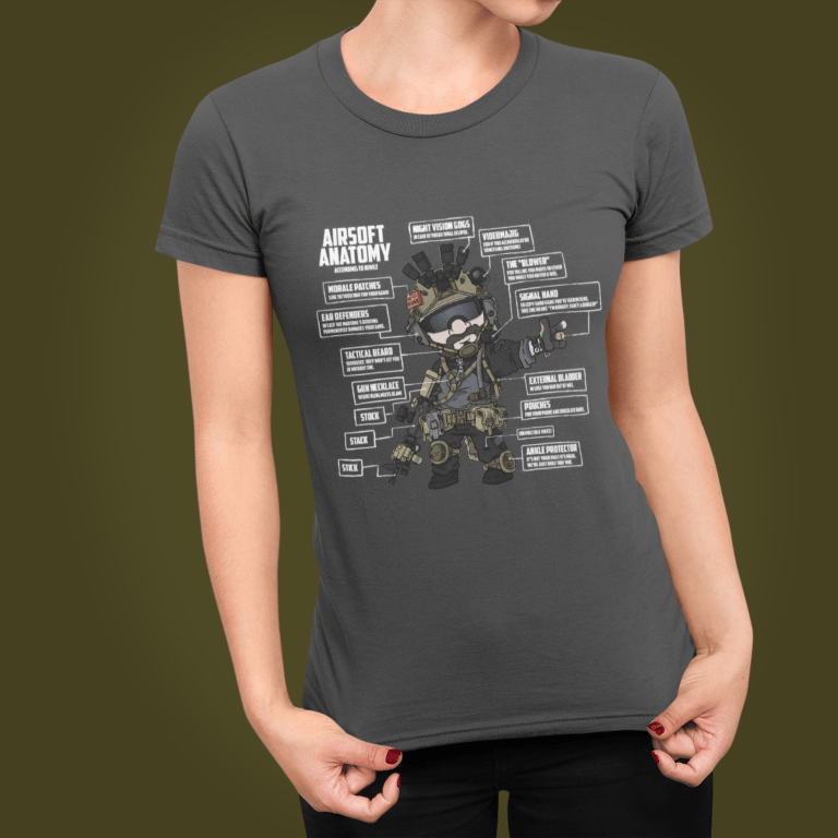 Chcete sa zoznámiť s úžasným svetom airsoftu? Naše tričko s kresleným ‚Airsoft Anatomy‚ vám poskytne úplne nový pohľad na tento vzrušujúci šport! 😀 Tento nápaditý design vám priblíží každú súčasť airsoftového zážitku. Takže, ak chcete byť pripravení na každú bitku, alebo len zábavne rozšíriť svoje znalosti o tom, čo sa skrýva pod povrchom airsoftu, toto tričko je pre vás! 🙂