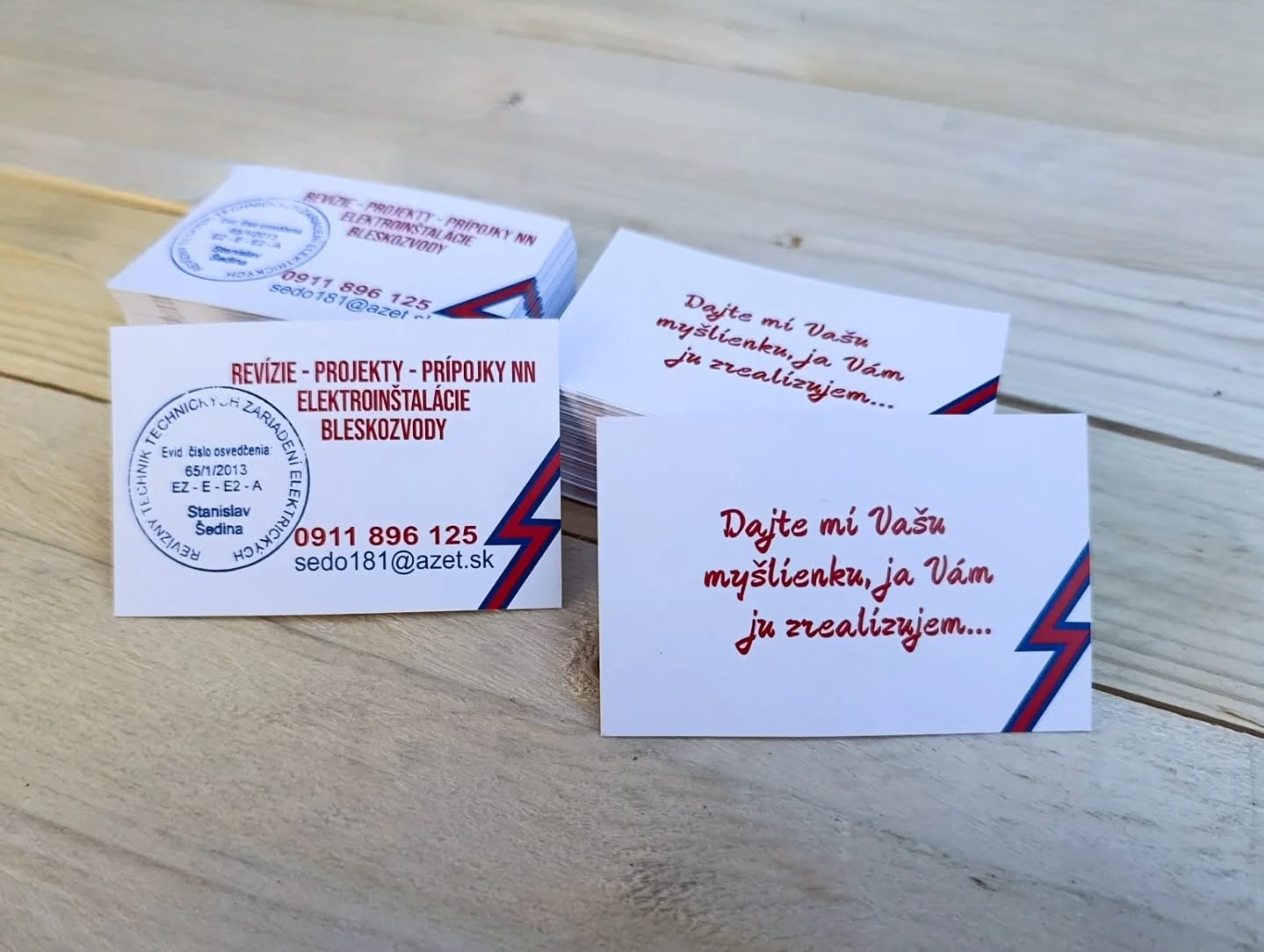 Materiál: Používame kvalitnú matnú kriedu s gramážou 350 g, ktorá vizitkám dodáva profesionálny vzhľad aj príjemný pocit pri dotyku.